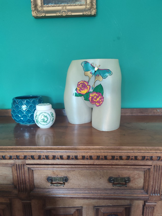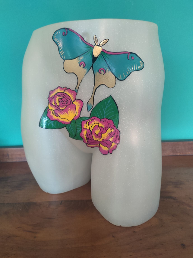 Made out of a recycled, fiberglass manaquin part, this solar lamp is hand painted with roses and a moth. It demonstrates the art of signpainting in the style of canal barge art. A beautifully feminine night time garden and a one of a kind original.